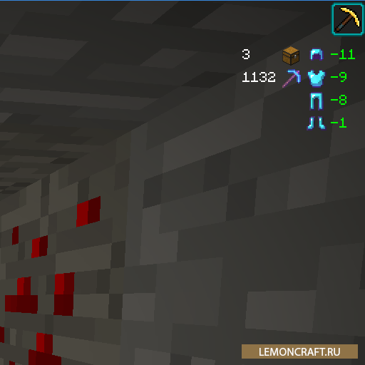 Мод Giselbaer’s Durability Viewer добавляет в верхний правый угол информацию о прочности вещей, который на вас надеты. Данная информация покажет вам какой у вас запас ударов кирки, какая прочность брони, сколько у вас свободных слотов в инвентаре. В зависимости от того в каком состоянии находится определенный показатель, он окрашивается в зеленый, желтый и красный цвета, что соответствует запасу прочности. Так же есть звуковое сопровождение о том, что вещь уже совсем негодная.